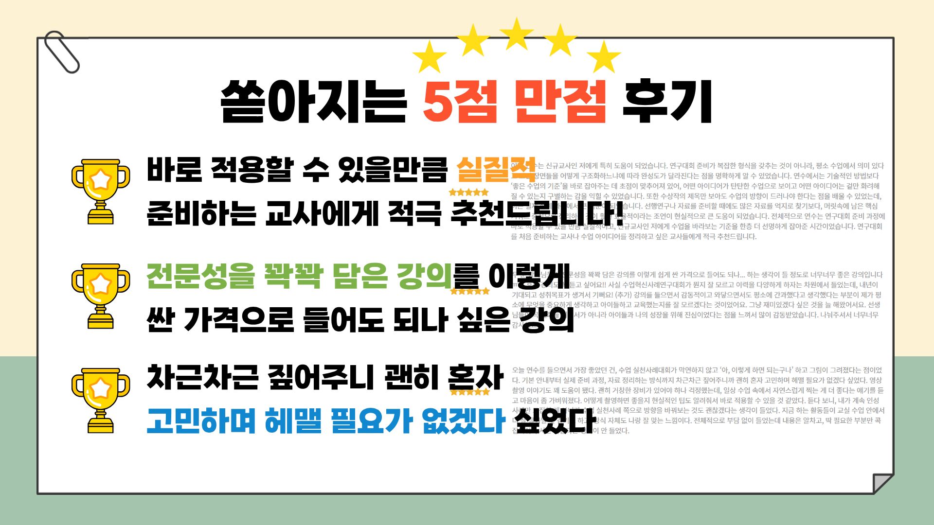 <강의 이력> 수많은 강의 이력과 쏟아지는 감동 후기를 확인하세요~! [초등]수업혁신사례연구대회 보고서 꿀팁 대방출 https://ssam.teacherville.co.kr/ssam/meet/7824.edu 2차 앵콜 https://ssam.teacherville.co.kr/ssam/meet/7897.edu 3차 앵앵콜 https://ssam.teacherville.co.kr/ssam/meet/8122.edu
