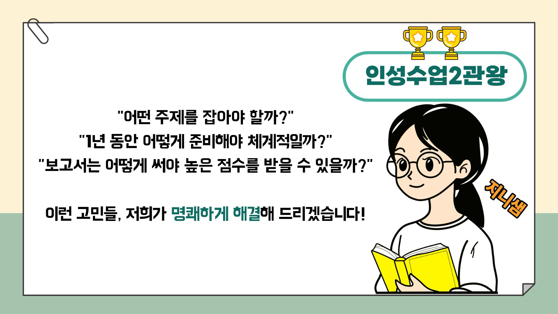수업혁신사례연구대회 3관왕 비니쌤과 인성+수업연구대회 2관왕 지니쌤 믿고 수강해주세요.