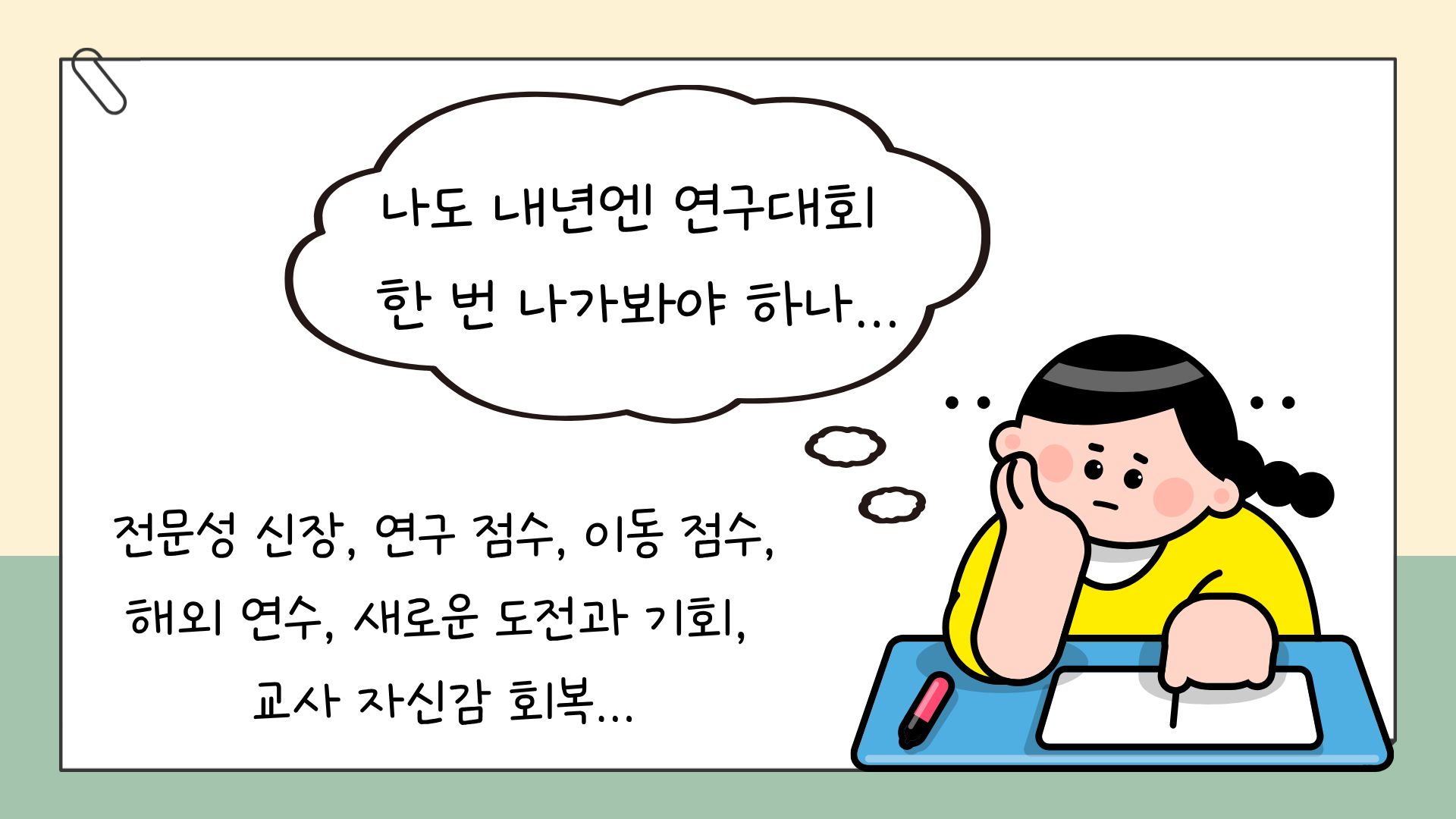 내년도 연구대회 도전을 고민하고 계신 선생님들께 시간을 아낄 수 있는 비결과 노하우를 한시간 반동안 아낌없이 몽~~~땅 나눠드립니다.