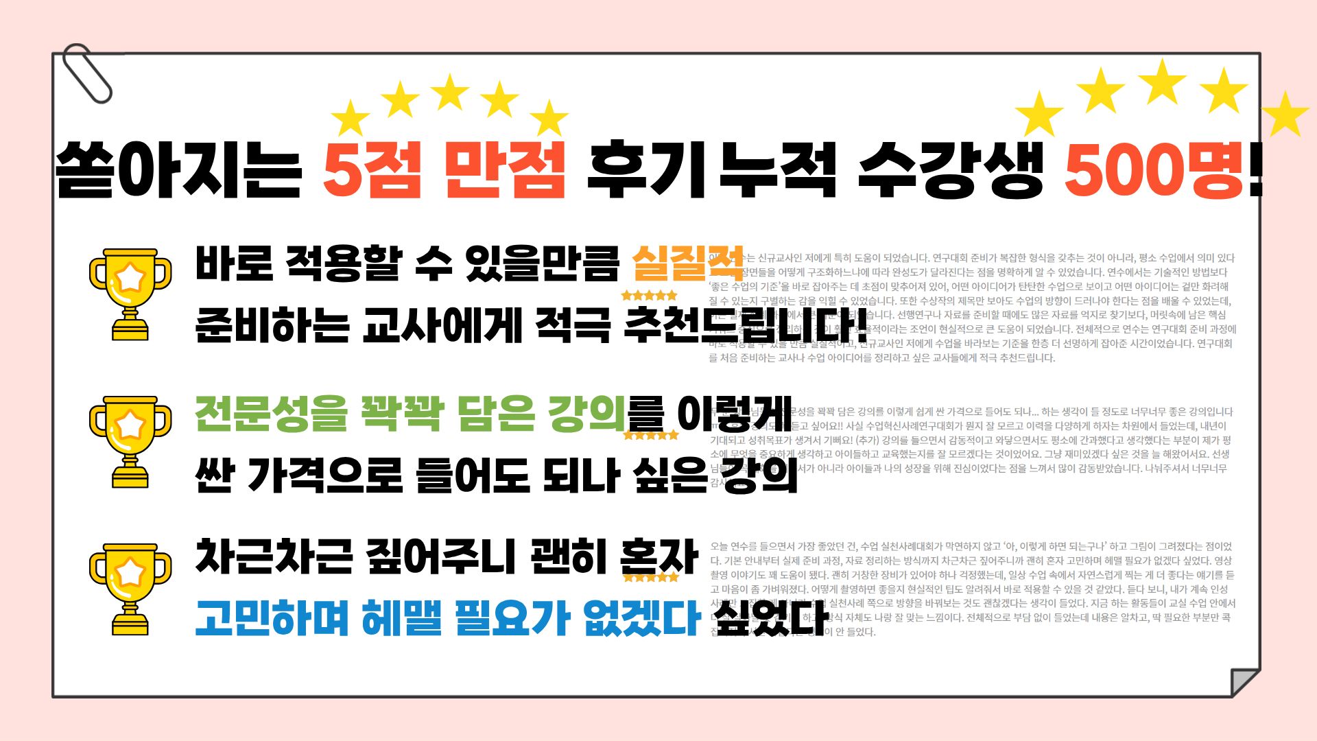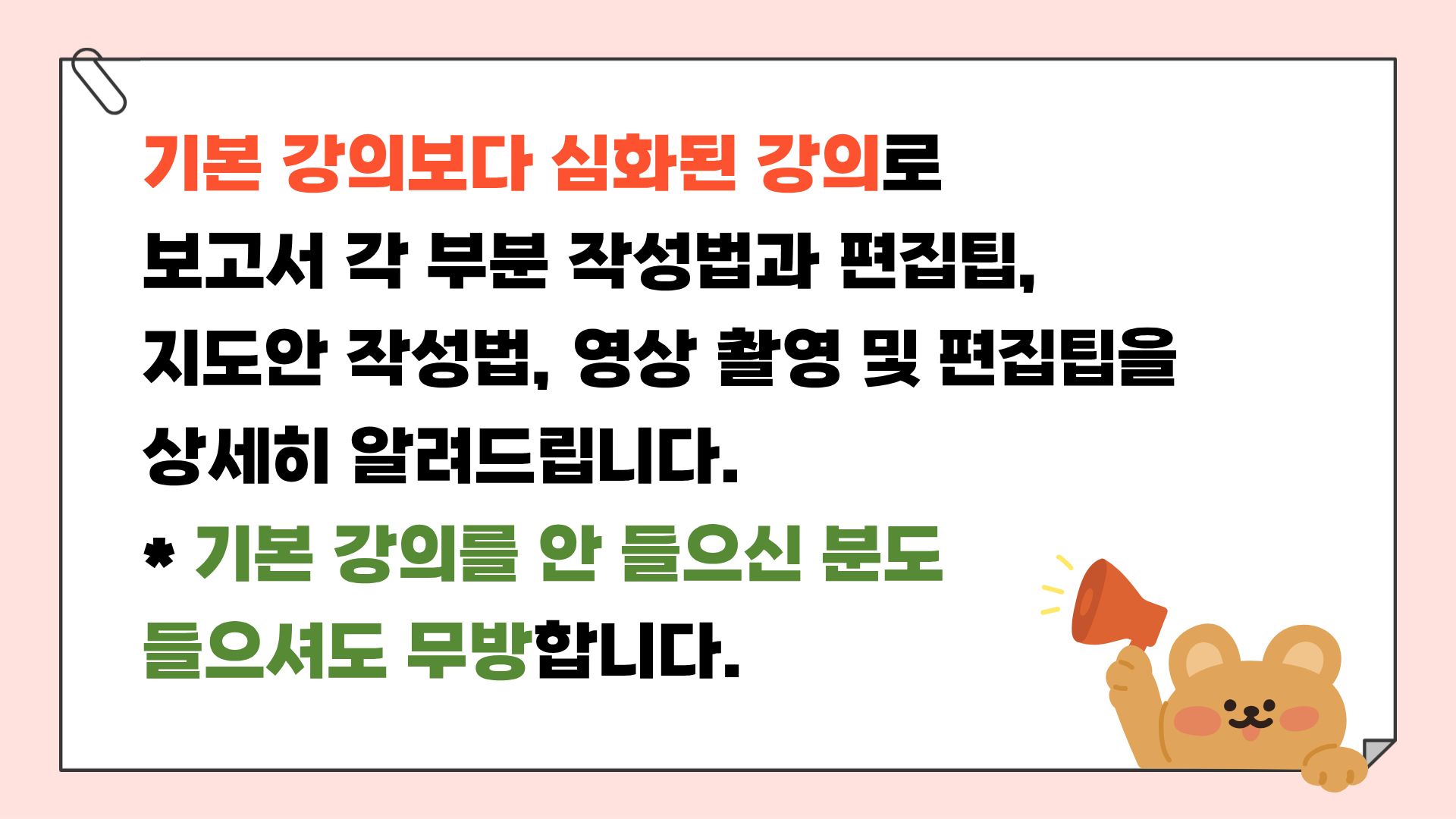 기본 강의보다 심화된 강의로 보고서 각 부분 작성법&편집팁, 지도안 작성법, 영상 촬영 및 편집팁을 상세히 알려드립니다.