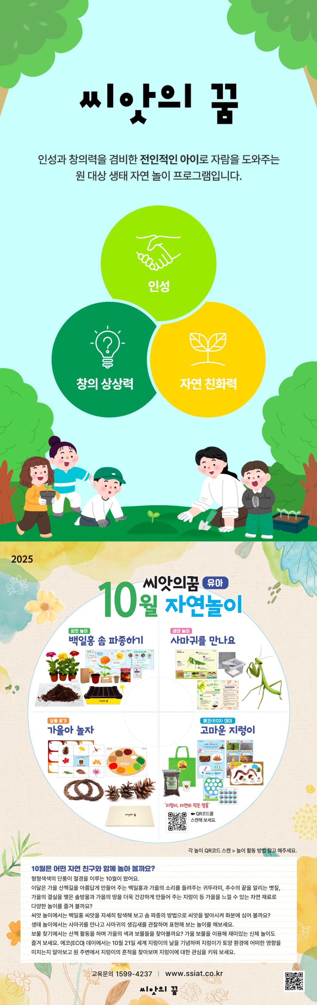 ‘씨앗의 꿈’은 영유아 대상 생태·자연 놀이 프로그램으로, 인성과 창의력, 자연 친화력을 골고루 기를 수 있도록 기획된 월별 주제 중심의 놀이 수업입니다.