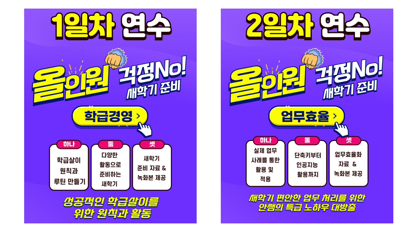 이번 All in one 연수는 1년을 편하게 만들기 위한 학급경영 마인드셋부터 업무 효율화 스킬까지 한 번에 잡을 수 있는 패키지 연수입니다.