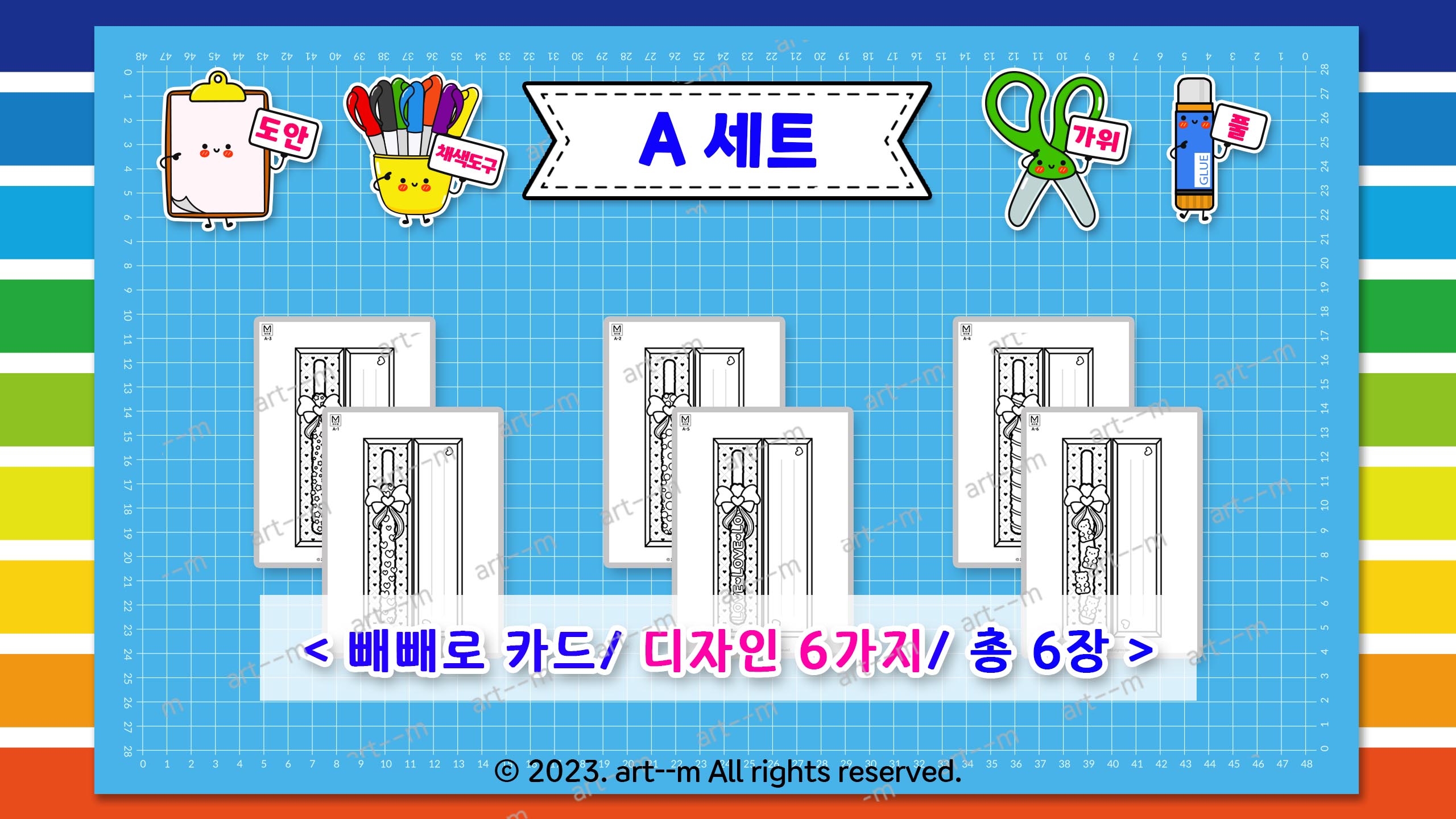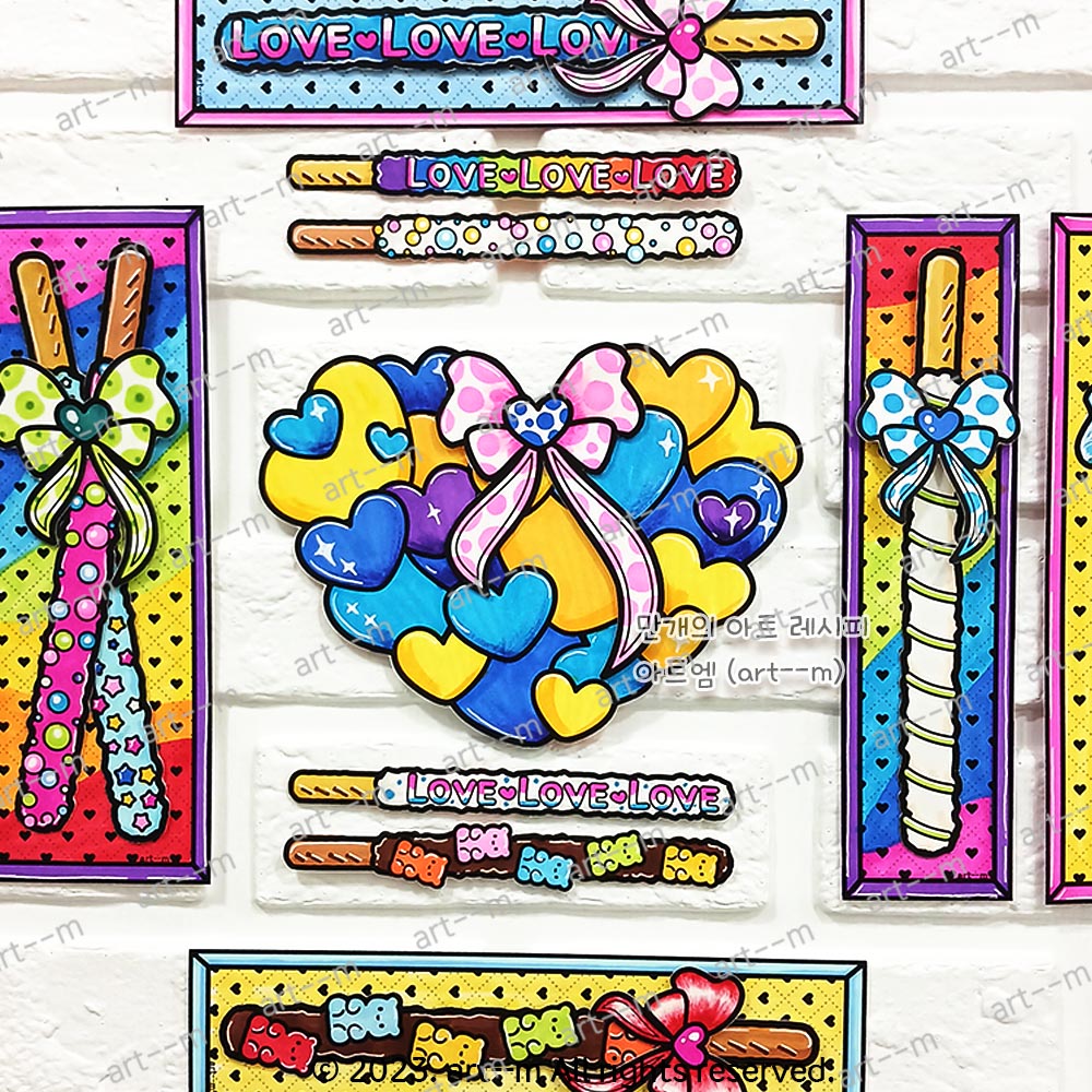 A 세트에는 하트, 곰젤리, 별, LOVE 등 6가지 디자인의 빼빼로 그림이 들어 있어요. 간단하게 빼빼로 카드를 만들어 볼 수 있는 도안입니다.