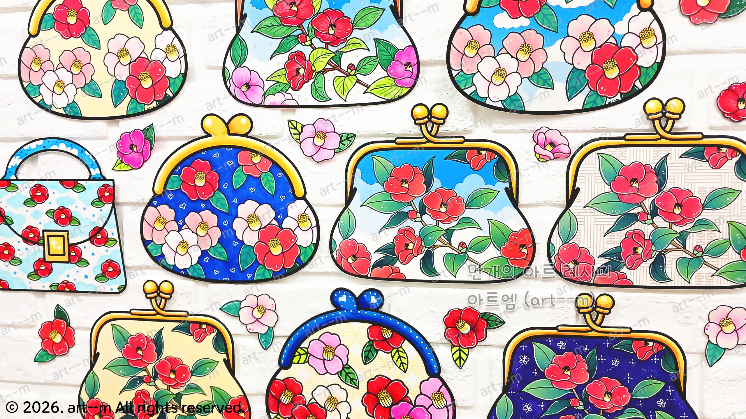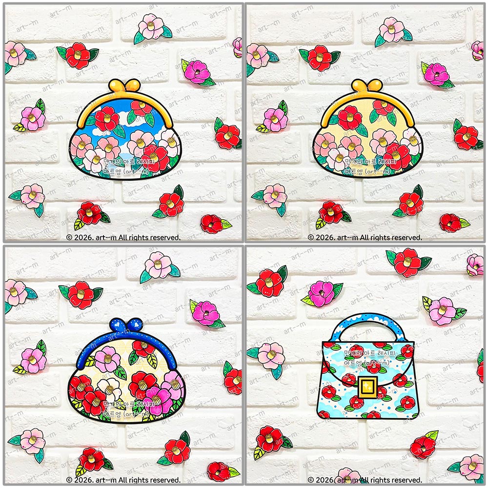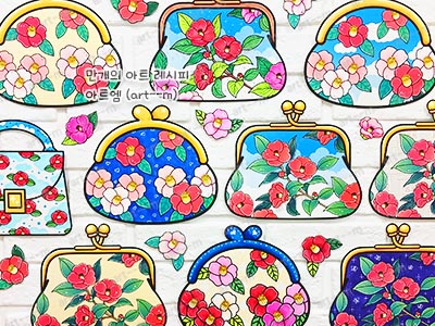 I 세트는 동백꽃 패턴이 들어 있는 쁘띠 손가방 색칠 도안입니다. 참고 자료와 하늘 배경이 있는 도안과 배경이 없는 도안으로 구성되어 있습니다.