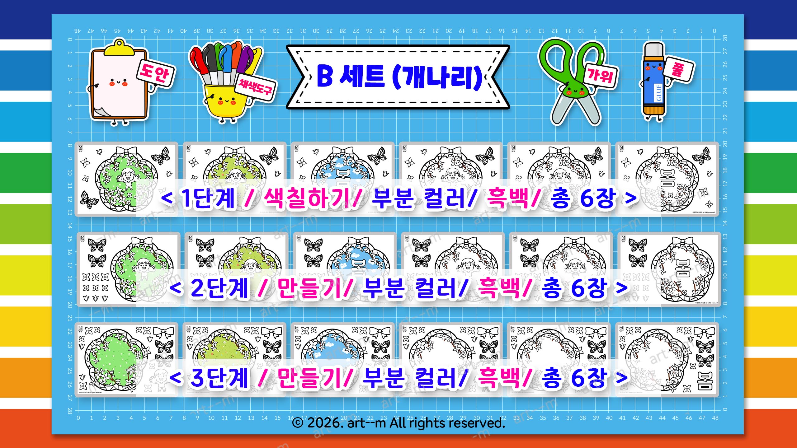 벚꽃 그림이 들어 있는 A 세트에는 색칠만으로도 완성할 수 있는 1단계 색칠하기 도안과 오리고 붙여서 만드는 2, 3단계 만들기 도안으로 구성되어 있습니다. 컬러 배경으로 완성도 높은 작품을 쉽고 간단하게 만들어 볼 수 있답니다.