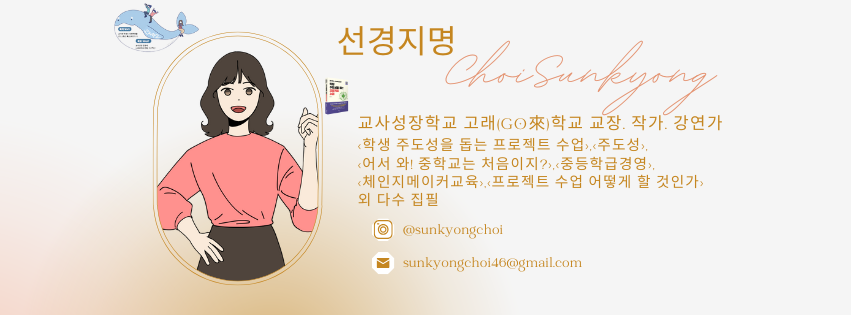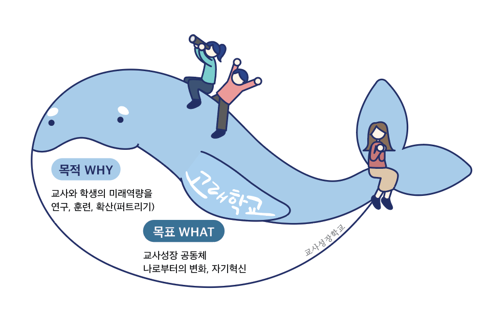 2019년부터 시작된 '고래학교'는 '교사 주도성'이 극대화 된 모임이라고 할 수 있습니다. '체인지메이커'를 자처하는 선생님들이 모여 '체인지메이커'를 길러내기 위한 여러 방법을 연구하고 '실천' 합니다. 나로부터의 변화를 바탕으로 동료와 학생의 변화까지 이끌어내고 있습니다. 각 멤버가 있는 자리에서 씨를 뿌리고 꽃을 피울 수 있도록 조력하는 교사 자발적인 모임입니다.