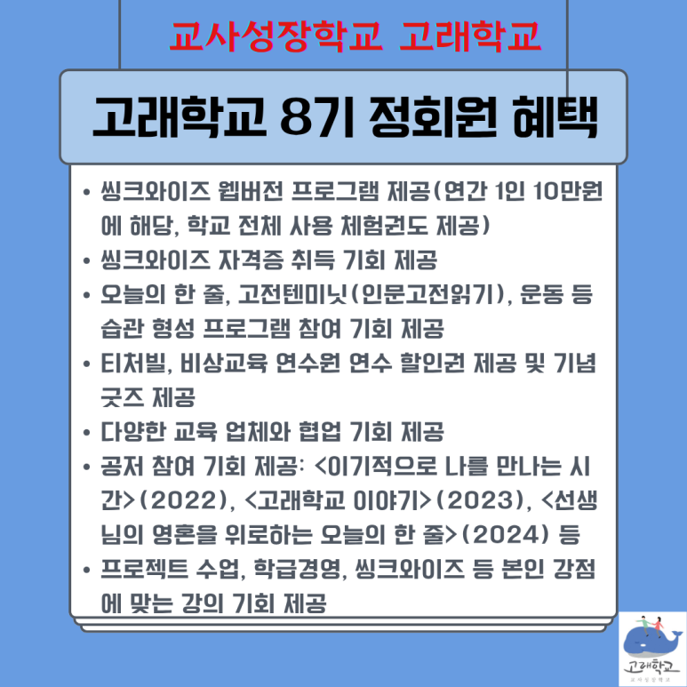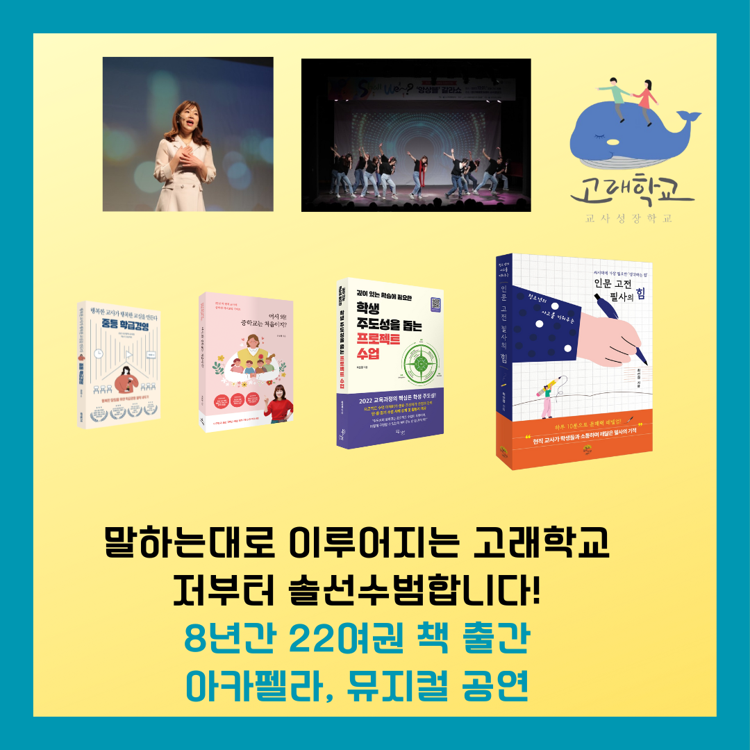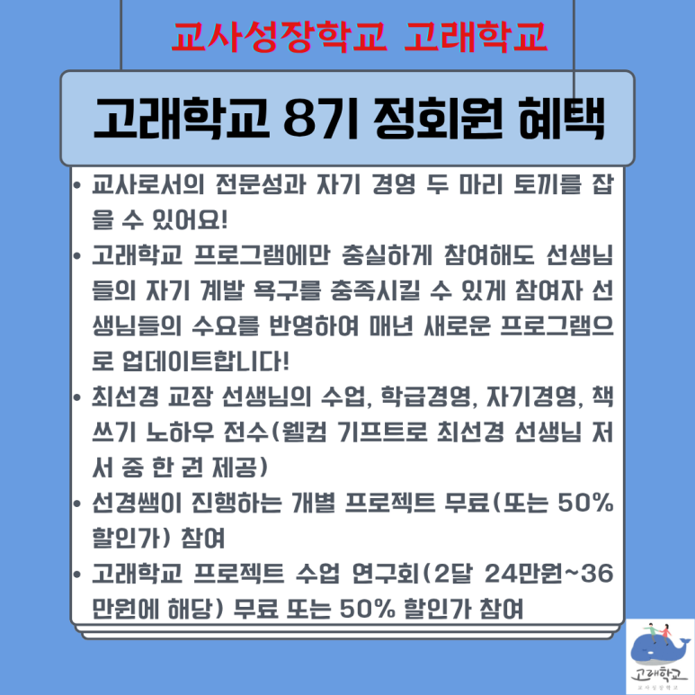 ★ 고래학교 멤버의 가장 큰 특전은 고래학교 교장인 선경쌤의 수업, 학급경영, 자기경영, 책쓰기 등 모든 노하우를 전수 받을 수 있다는 것, 교장 선생님이 진행하는 개별 프로젝트 무료(또는 할인가)로 들으실 수 있다는 것, 무엇보다 선생님을 응원하고 지지해 줄 든든한 동무들이 생긴다는 것입니다!