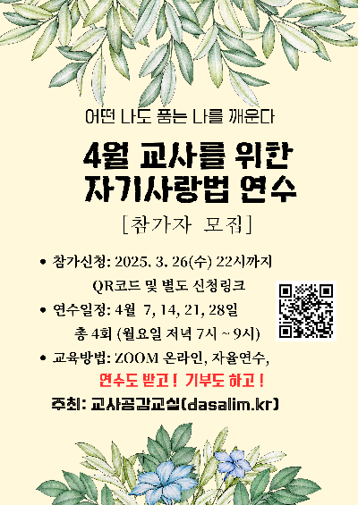 세상의 모든 선생님들이 행복하시길 바랍니다. 11월, 자기사랑법 연수에서 자신을 돌보는 시간을 가져보세요. 작은 쉼이 곧 학생과 세상을 따뜻하게 품는 힘이 됩니다.