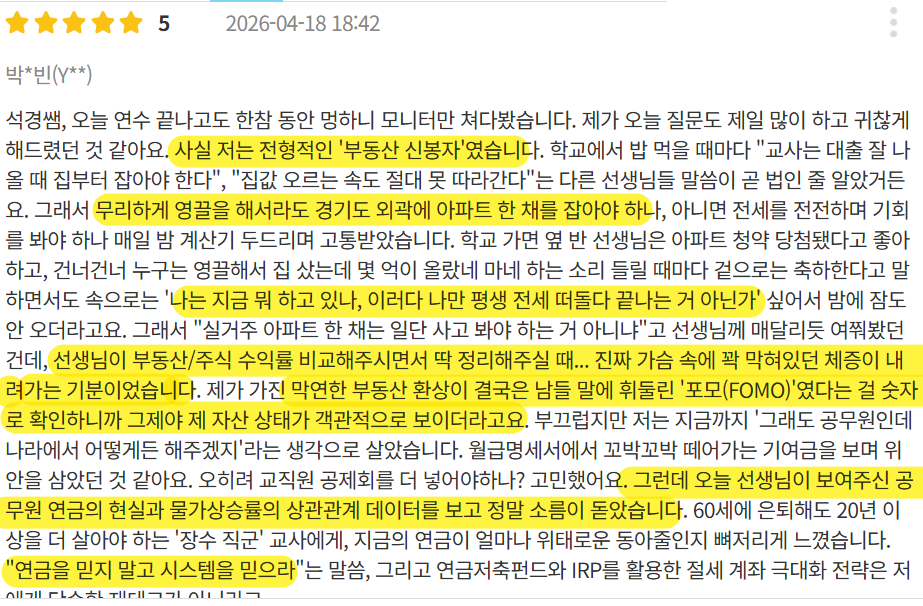 깊이가 남다르고, 제공해주시는 자료가 장난이 아닙니다. 2시간 순삭이었고, 쉬는 시간에도 질의응답하셔서 자리 비울 시간이 없었습니다. 이 강의가 길잡이가 되어서 은퇴 후까지 바라볼 수 있을 것 같아요. 선생님 강의 4시간, 밤새 해도 재미있게 들을 것 같아요.