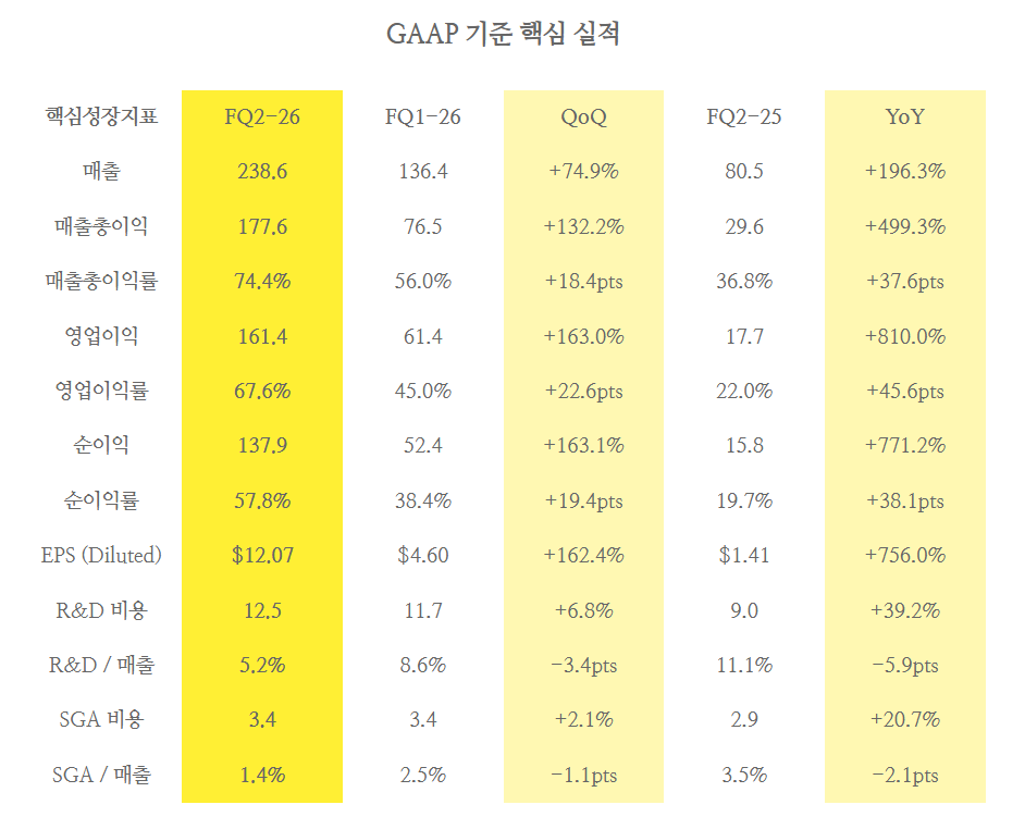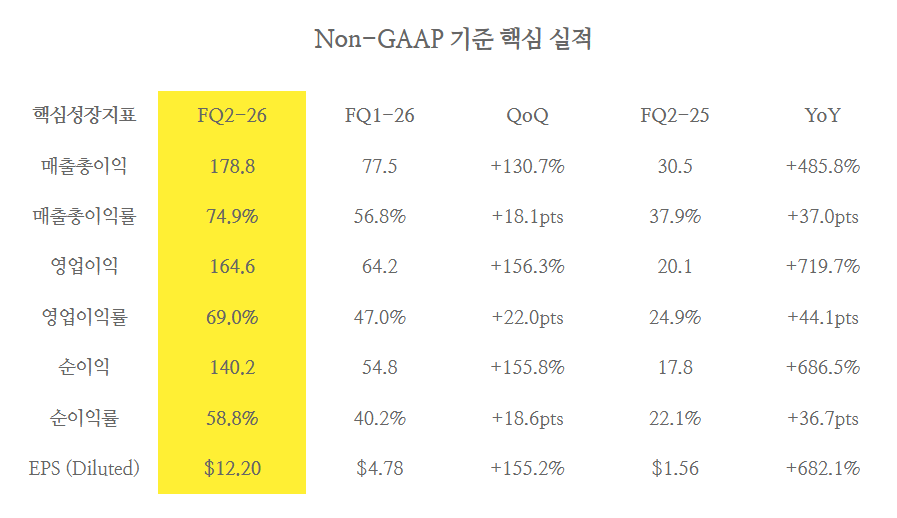 FQ2-26 매출총이익률 74.4% / EPS $12.07은 메모리 역사상 전례 없는 수준입니다.