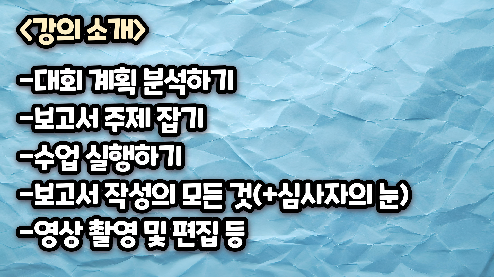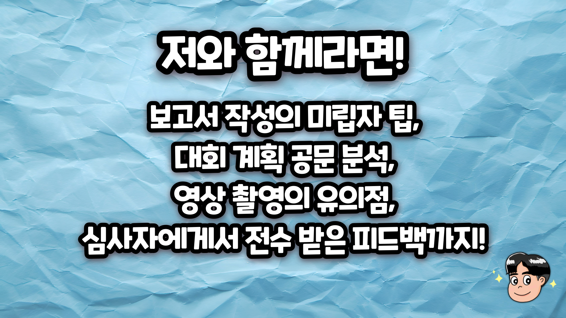 보고서 작성은 물론 공문 분석, 심사자에게 전수 받은 팁, 영상 제작 방법 등 모든 것을 공유해 드립니다!