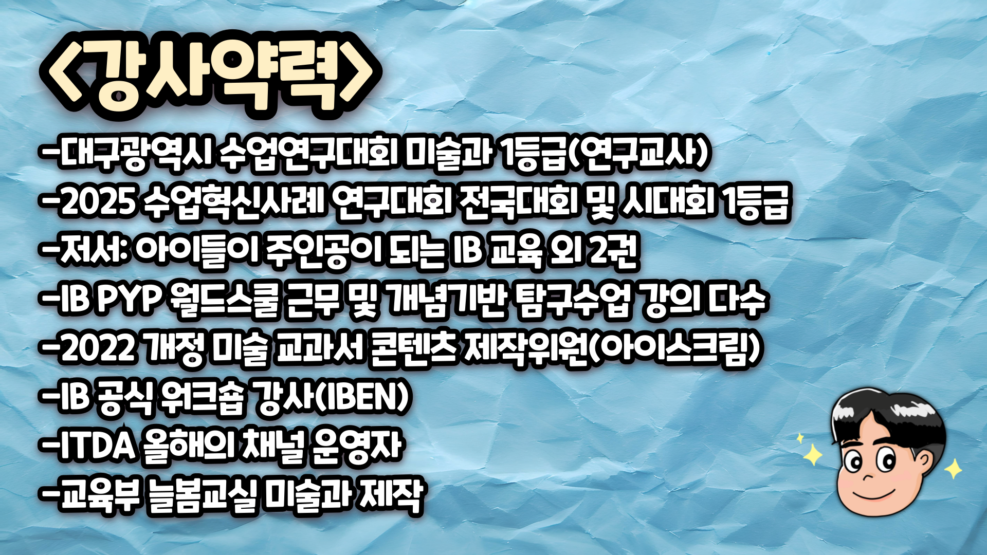 -대구광역시 수업연구대회 미술과 1등급(연구교사) -저서: 보람재신쌤의 미술견문록(2023) -IB PYP 월드스쿨 근무 및 개념기반 탐구수업 강의 다수 -2022 개정 미술 교과서 콘텐츠 제작위원(아이스크림) -IB 공식 워크숍 강사(IBEN) -ITDA 올해의 채널 운영자 -교육부 늘봄교실 미술과 제작