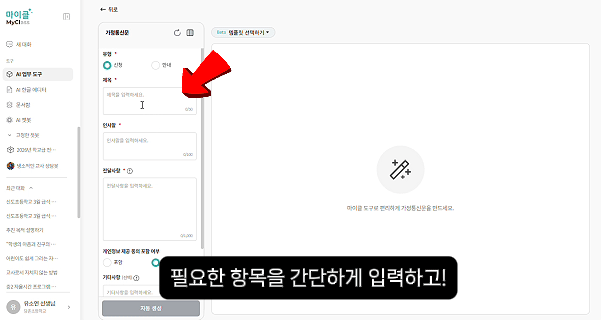 왼쪽 입력창에 핵심 내용만 간략히 적어요. 가정통신문이라면 유형, 제목, 인사말, 전달사항 정도면 충분합니다.