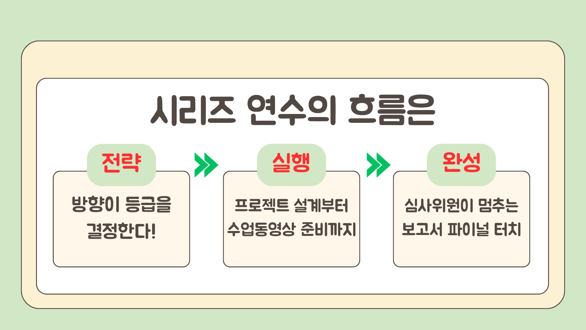 1️⃣전략편에서 연구대회 1등급 타임라인을 설정하고, 반드시 등급을 따는 필승 전략을 수립해요.