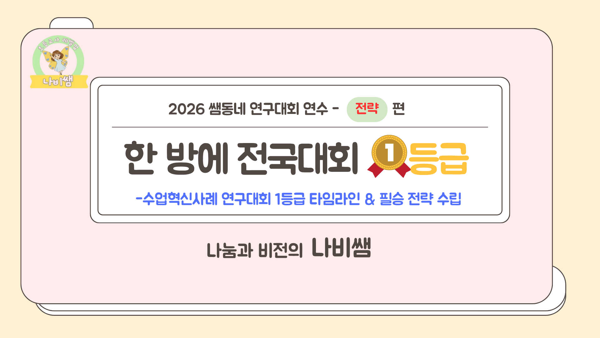 필요한 시기에 딱딱 맞추어 진행되는 나비쌤의 시리즈 연수로 🏫스터디처럼 연구대회 외롭지 않게 막막하지 않게 함께 준비해요!