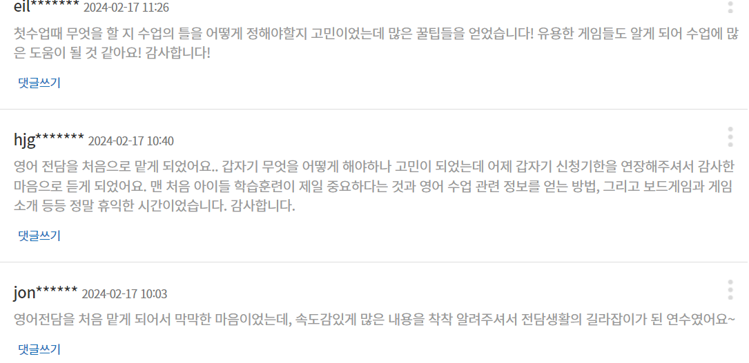 1. 연수 내용 : 영어수업 쉽고 빠르게 준비하는 법, 영어 수업시간에 아이들 집중하게 하는법, 영어시간게임추천, 영어전담추천책, 영어보드게임목록 추천 등