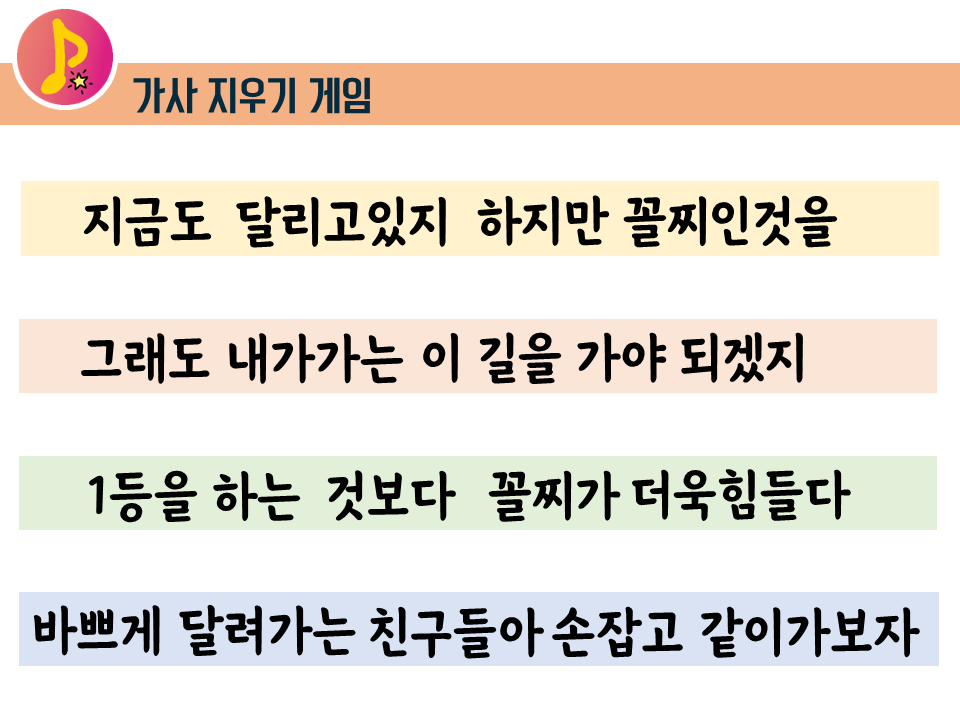 가사가 하나씩 지워질 때마다 노래의 뜻을 생각하며 부를 수 있도록 하면 좋습니다. '꼴찌'라는 단어가 많이 들어가므로 '꼴찌'를 부르지 않으면서 불러보는 것도 노래를 재미있게 부르는 방법입니다.