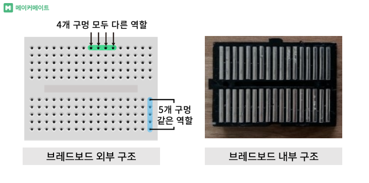브레드보드 내부의 구조는 세로 줄과 가로 줄로 구성되어 있으며, 세로 줄은 공통된 핀으로 연결되어 있어 같은 전력을 공유하고, 반면 가로 줄은 각각