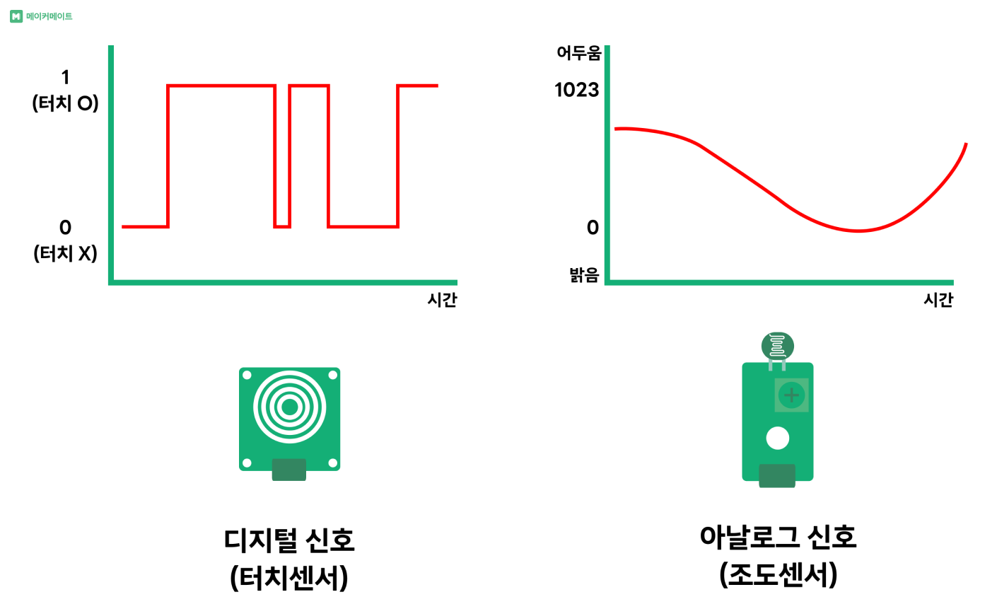 아날로그 신호 : 아날로그 신호는 연속적인 값을 가지며, 아두이노의 경우 0 ~ 1023까지의 범위로 값을 표현합니다.