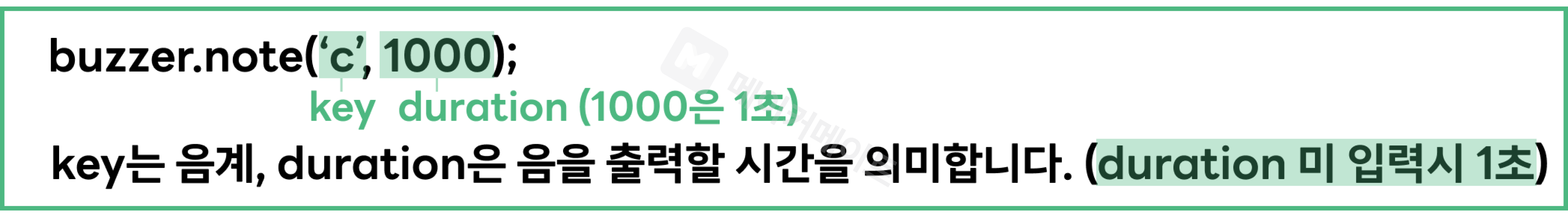 부저의 음계 출력시간을 설정할 수 있습니다. 예를 들어, buzzer.note('c', 500);의 코드를 작성하였다면, c(도) 음계를 0.5초 간 출력하게 됩니다. 즉 note('c')에서 콤마와 숫자를 입력하게 되면 음의 출력 시간을 설정할 수 있습니다.