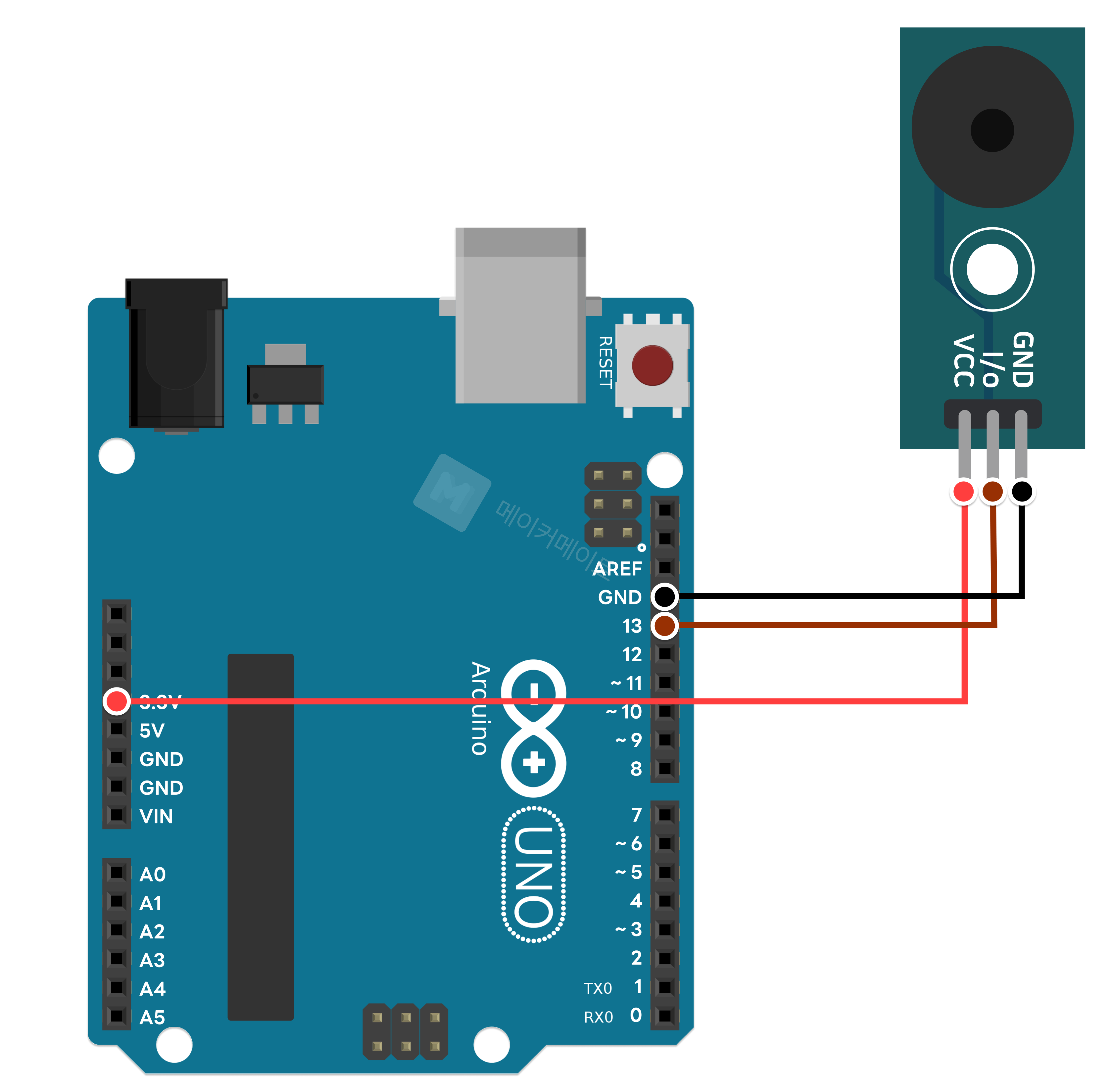 2. 아두이노에 피에조부저의 I/O(13번 핀), VCC(3V3), GND를 연결합니다.
