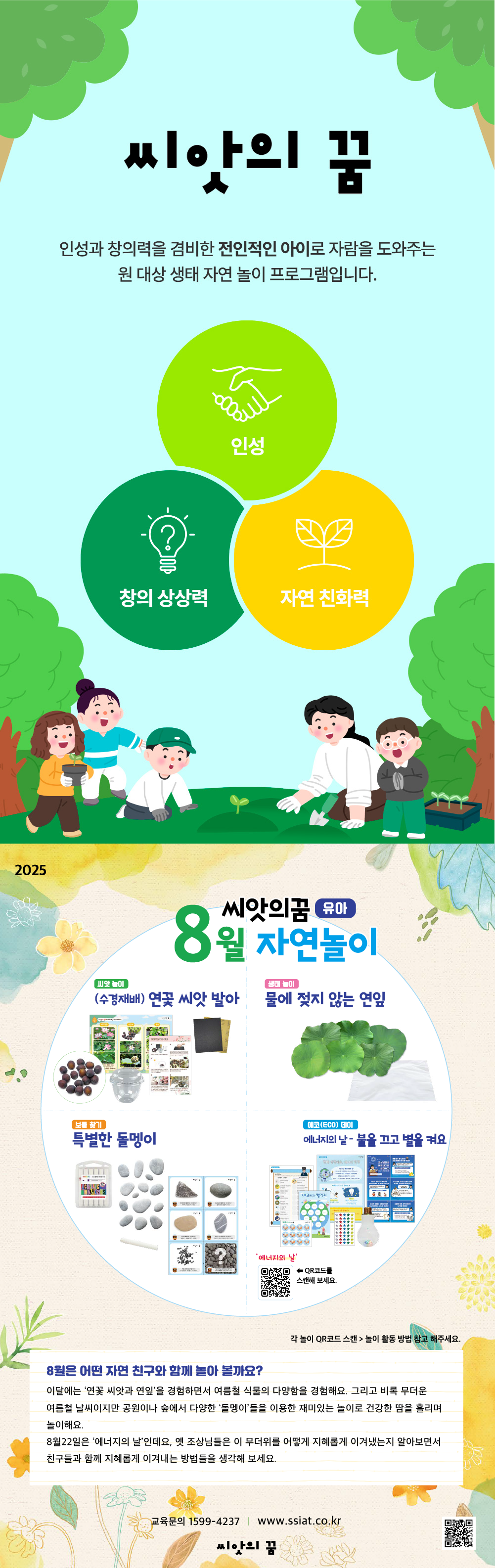 ‘씨앗의 꿈’은 영유아 대상 생태·자연 놀이 프로그램으로, 인성과 창의력, 자연 친화력을 골고루 기를 수 있도록 기획된 월별 주제 중심의 놀이 수업입니다.