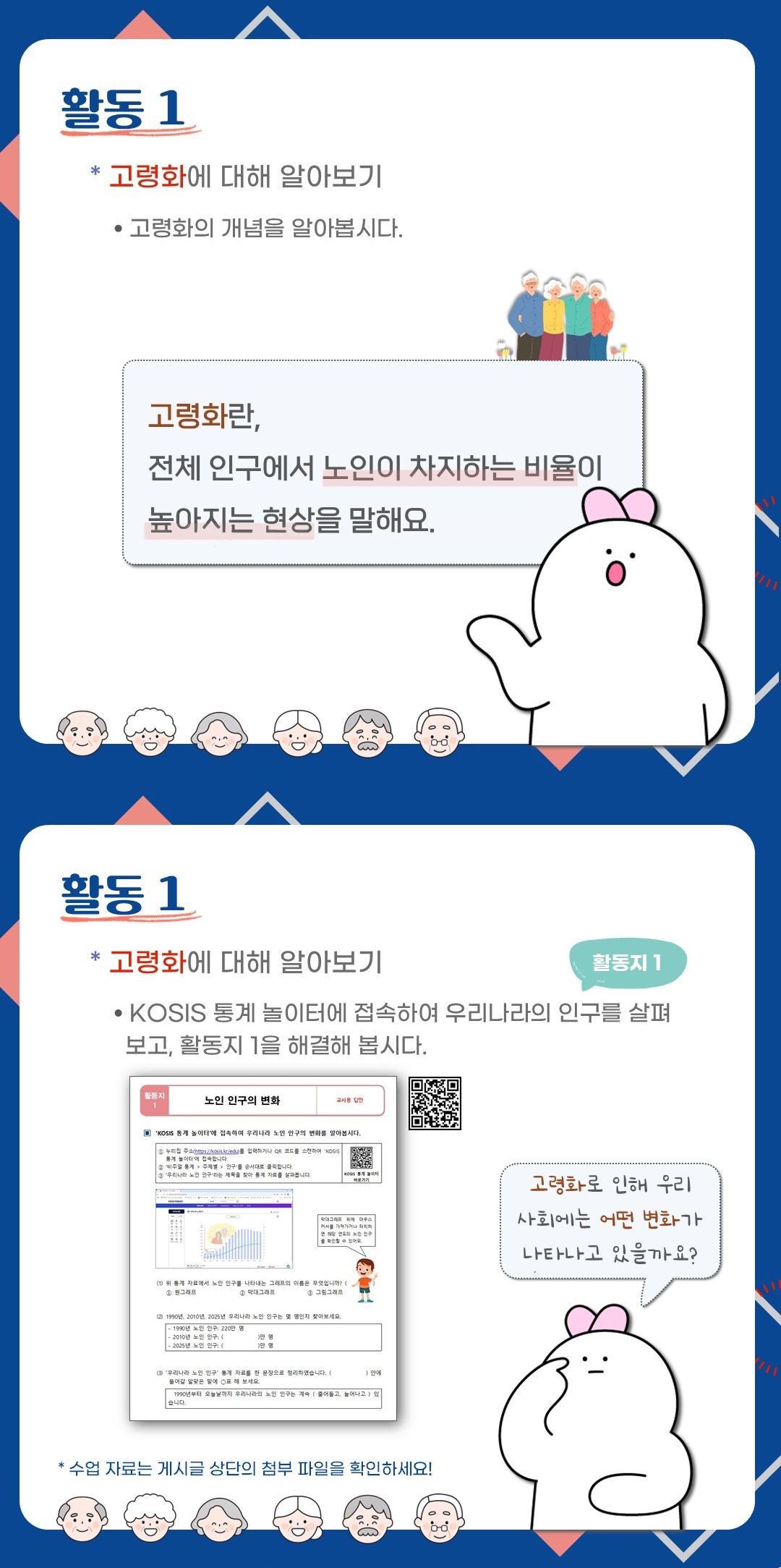 고령화를 대비하여 우리 사회에 필요한 것을 고민해 보는 저출산·고령화 교육 수업 자료를 소개합니다.