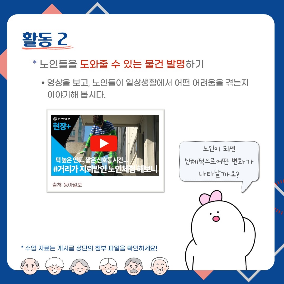 노인들이 일상생활에서 겪는 어려움을 이해하고 고령화 사회를 준비하는 마음을 길러 봅니다.