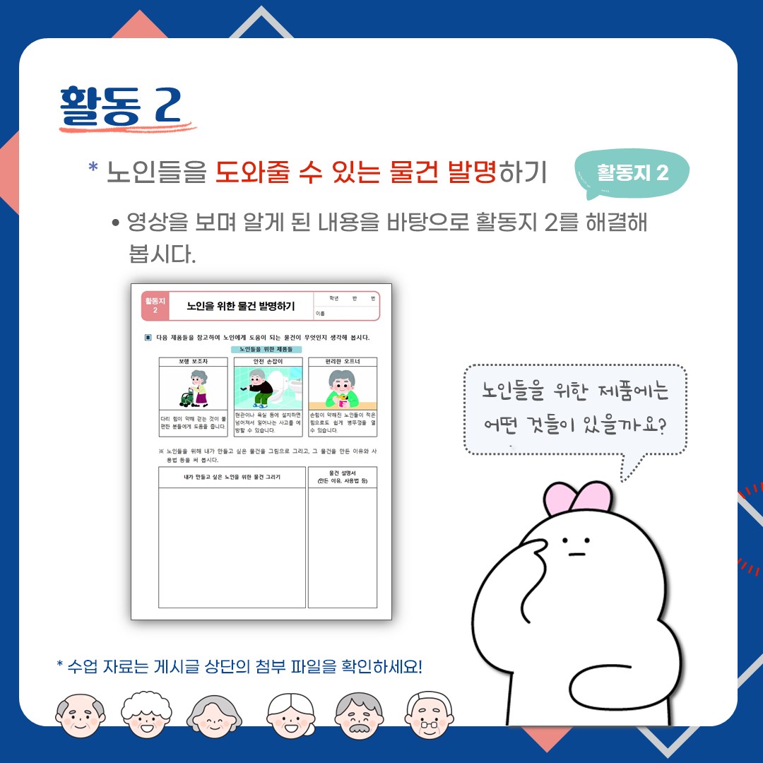 🎉 첨부 파일 자료 구성: '노인이 많아지고 있어요수업 PPT, 수업지도안, 활동지 제공