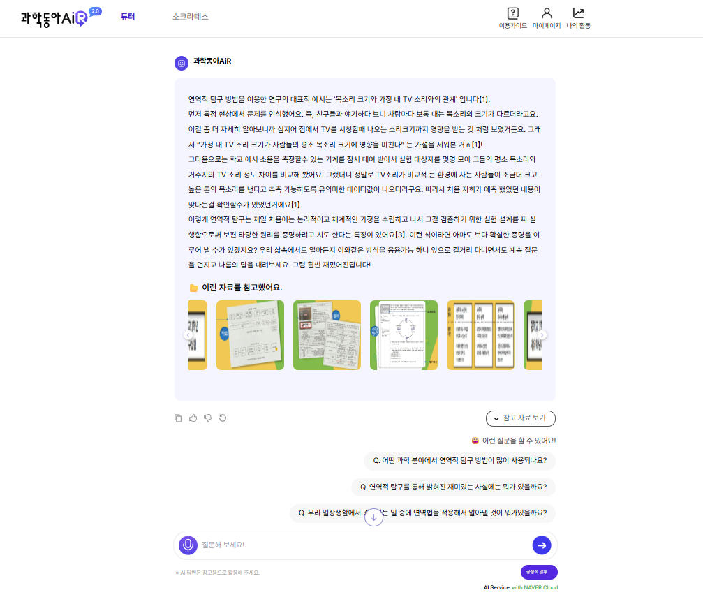 튜터 : 과학·수학 기사에 기반해 요약 답변을 제공하고, 근거 기사도 함께 보여줍니다. 질문에 대해 인공지능이 더 정확히 이해하고 답할 수 있도록 추천 질문을 함께 제공해 질문의 깊이나 방향을 조정할 수 있게 돕습니다.