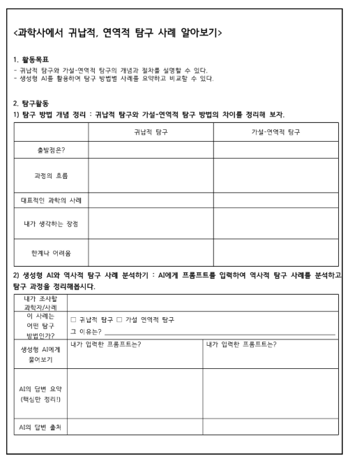 연역적·귀납적 탐구 방법을 과학사의 실제 사례와 연결해 이해하도록 설계된 점이 특징이에요. 학생들이 단순 개념 암기가 아니라, AI 탐구를 통해 탐구의 구조를 직접 재구성해보는 경험을 할 수 있도록 기획되었습니다.