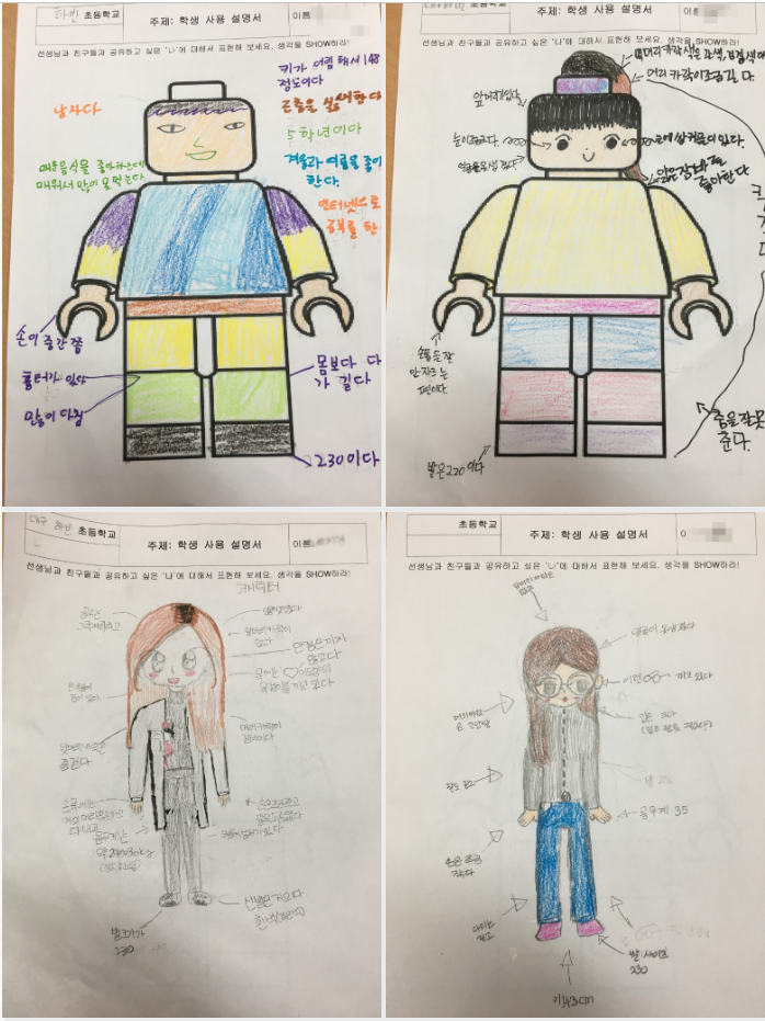 자신의 특징을 그림으로 잘 표현한 친구는 스스로 캐릭터를 만들어 설명을 하기도 했고, 조금은 부족한 친구들은 자신을 상징하는 레고 캐릭터 만들기를 통해 자신을 표현해 보았습니다.