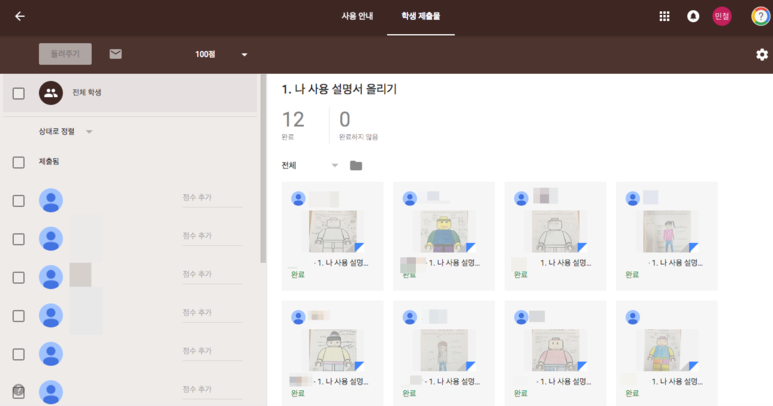 이렇게 학생들의 제출된 과제물을 한눈에 볼 수 있습니다.