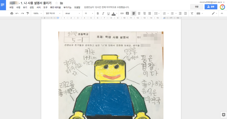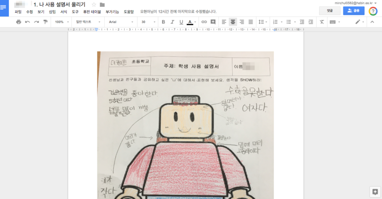 우선 이번 한 주 동안은 비주얼 씽킹을 활용하여 스스로에 대해 알아보기를 지속적으로 지도하고 있습니다. 그래서 구글 클래스룸을 활용해 업로드를 하고 구글 문서에 자신의 사용법에 대한 설명을 탑재하도록 지도하였습니다.
