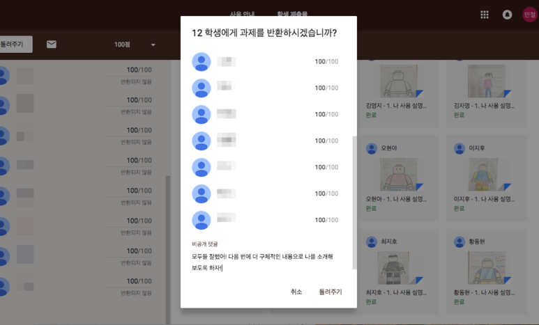 과제를 모두 검사한 후에는 점수부여와 함께 해당 학생만 혼자 볼 수있는 비공개