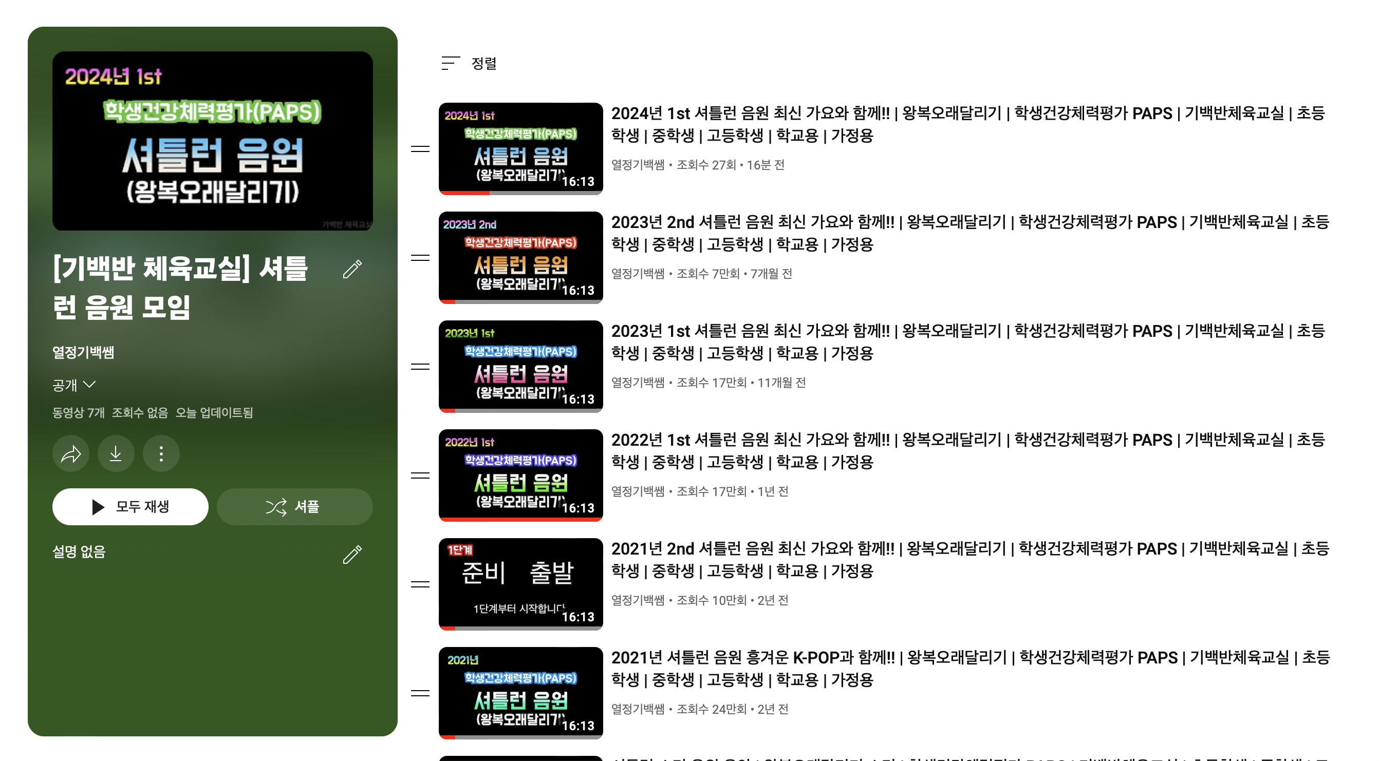 마지막으로, 아래 셔틀런 재생목록은 2020년부터 열정기백쌤이 제작한 셔틀런 음원을 모아놓은 것입니다. 시대적 흐름을 느낄 수 있는 곡들이 있으니 많이 사랑해주세요❤️