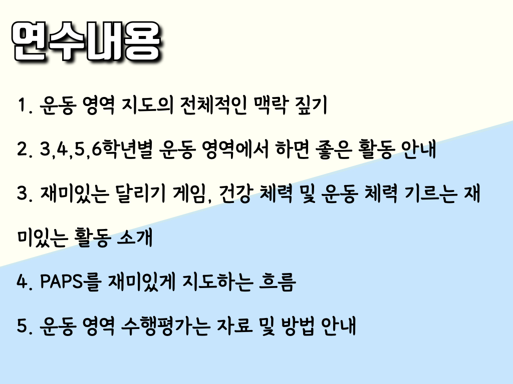 지난 3월 초에 기백반 체육교실 자율연수 1,2,3일차를 열어 초등체육이 나아가야할 방향, 3월 체육 수업, 루틴한 체육 수업 설계하기에 대해 이야기를 하였습니다.