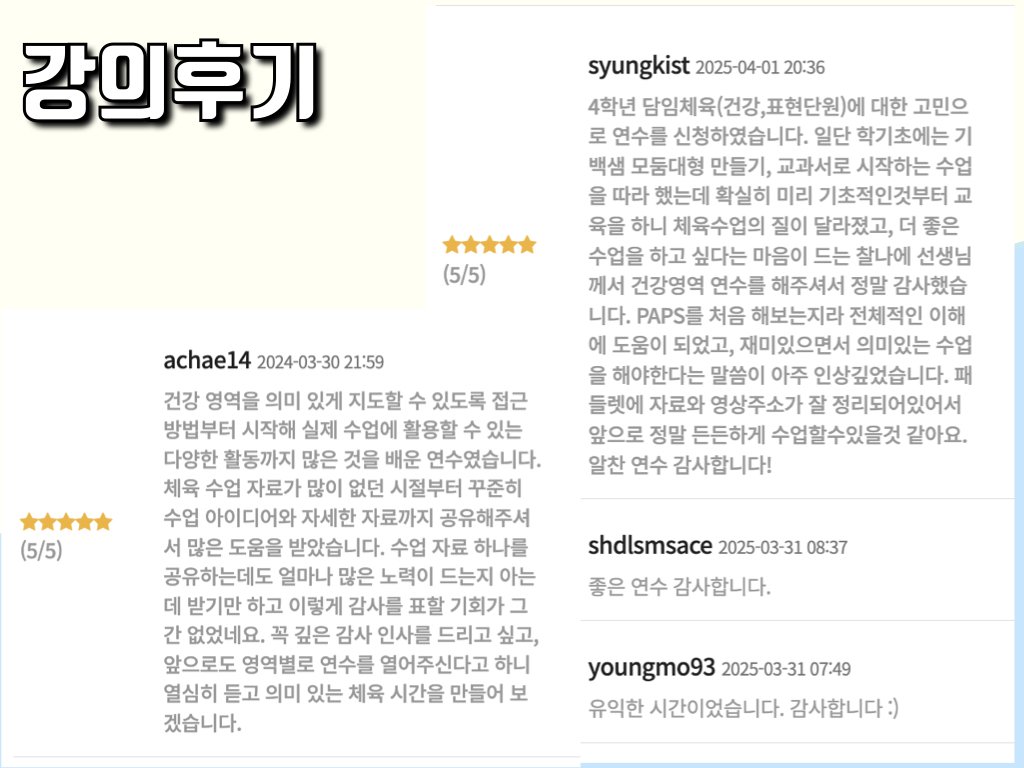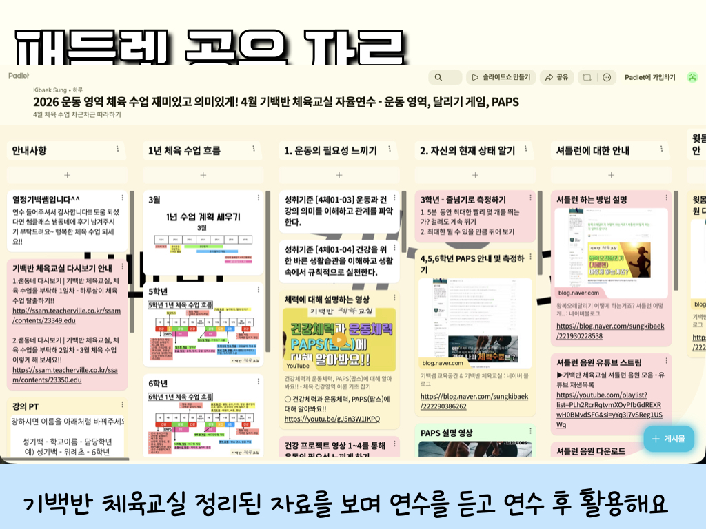 연수와 함께 패들렛 링크로 4월 체육 수업에 필요한 자료 공유합니다. 이 내용 바탕으로 체육 수업 즐겁게 하시면 좋겠습니다.