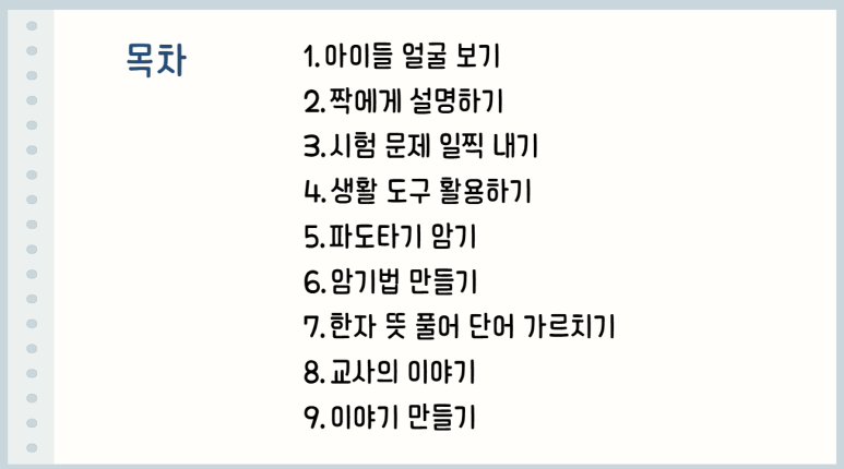2부. 학생 집중을 끌어내는 ‘설명 방식’과 수업 아이디어 🧩 어려운 개념을 쉽게 만드는 설명 전략(생활도구·실물 활용) 🌊 암기/개념 정착을 돕는 활동 아이디어 🎯 도입을 살리는 스토리텔링과 수업 분위기 만들기 💬 ‘동기유발’ 아이디어