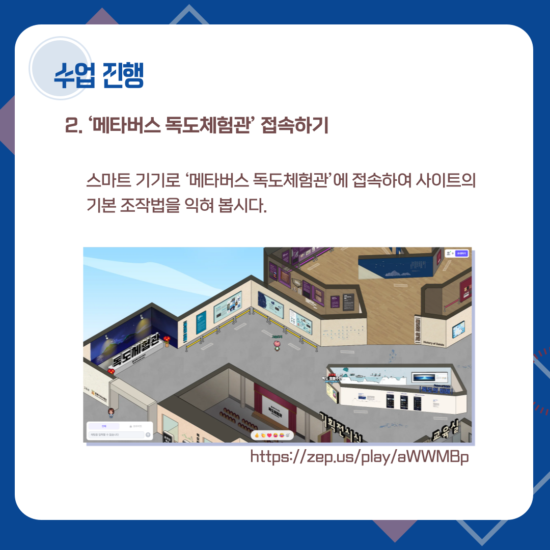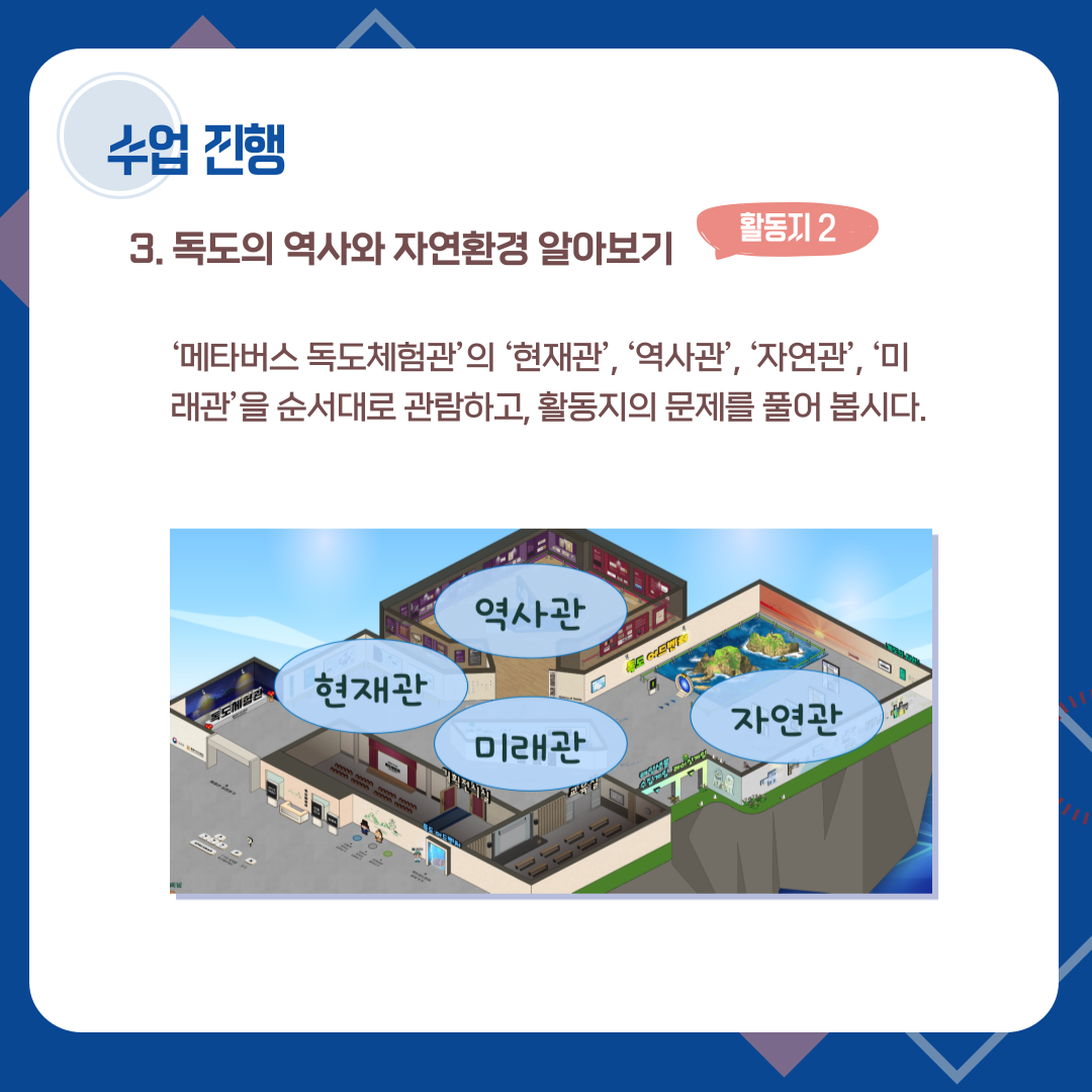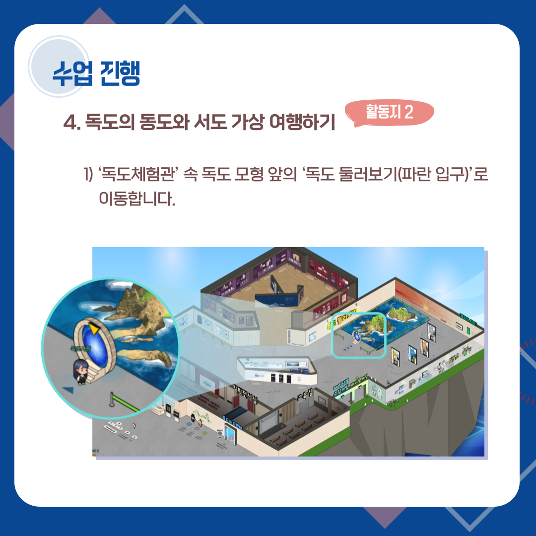 '메타버스 독도체험관'을 관람하며 독도의 역사와 자연환경을 살펴보고,