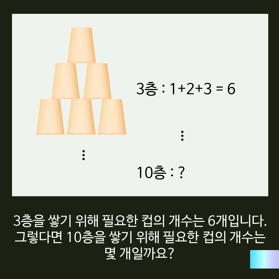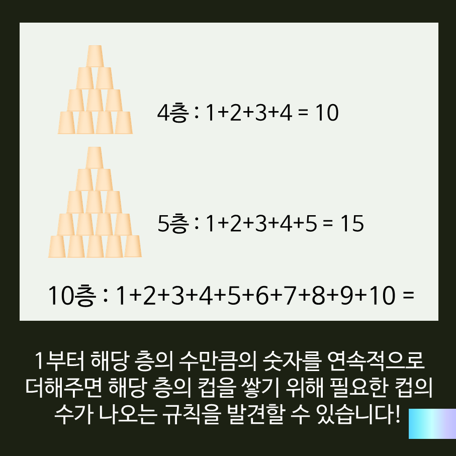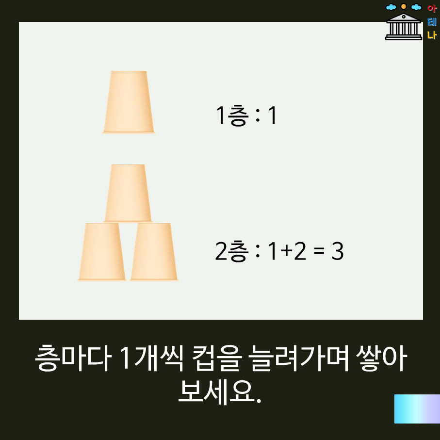 이때, 각 층에 몇개의 컵이 들어가도록 쌓는지 수학식으로 바꾸어 본다면 어떨까요~