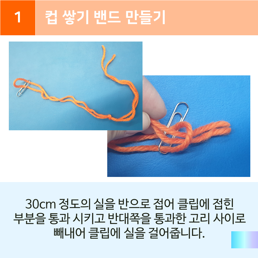 물론 이미 만들어져있는 도구를 구입할 수도 있습니다만, 주변에서 쉽게 구할 수 있는 고무줄과 클립, 털실이나 노끈? 운동화끈? 등이면 손쉽게 도구를 만들 수 있습니다.