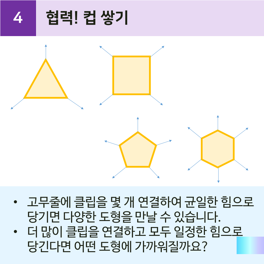 또 어떻게 힘을 일정하게 주어서 정다각형을 만드느냐가 성공의 관건이기 때문에 집중하고 관찰하여 대화할 수 밖에 없지요.