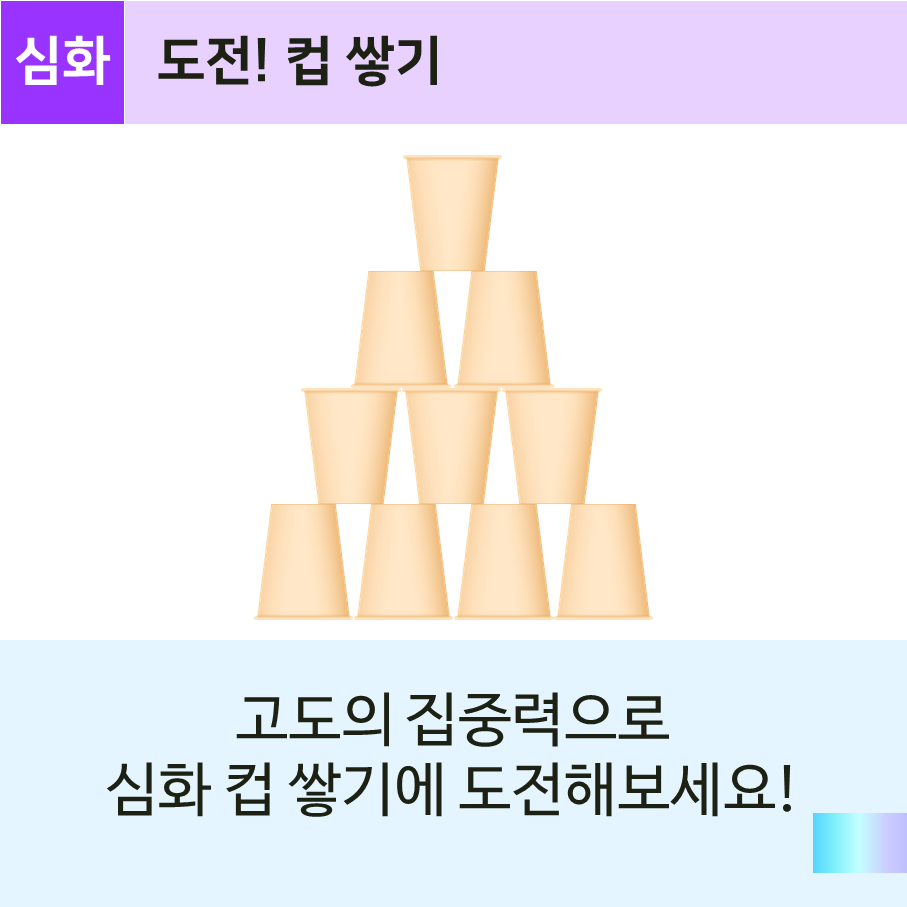 컵을 쌓다보면 어떤 구조가 안정적일지 생각해보기도 하고, 층마다 몇개의 컵을 쌓는게 안정적인지 고민하게 됩니다. 물론 정해진 쌓기 구조를 탈피했을 때 말이지요~